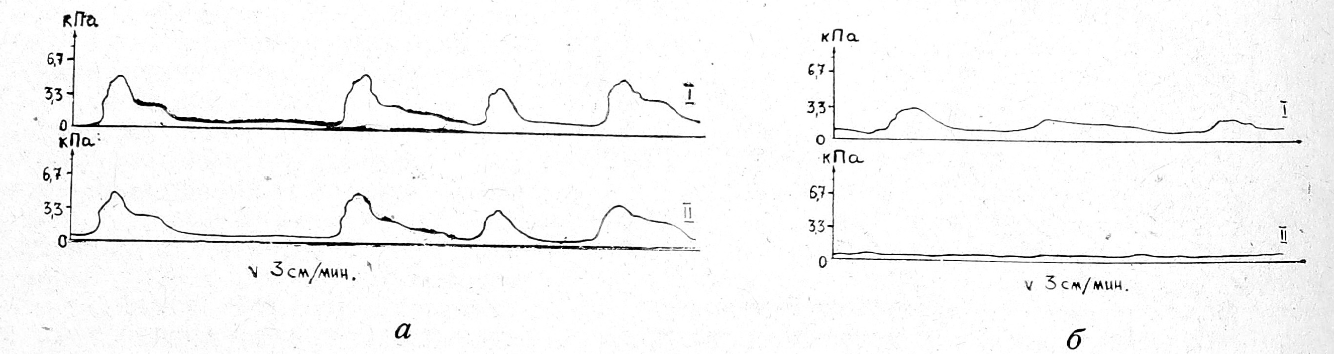 Кроме того, различие в величинах внутриматочного давления может быть обусловлено функциональной гидродинамической полостью матки в нижнем сегменте матки, которая образуется во время схватки и ограничивается стенкой матки в нижнем сегменте, плечиками и головкой плода [1]. Наличие данной функциональной гидродинамической полости доказывается зоной повышенного внутриматочного давления в процессе регистрации схваток в области нижнего сегмента матки за счет его активного сокращения во время схватки (рис. 2, а и б). При нормальном течении родов (рис.„ 2, а) отмечается высокая активность нижнего сегмента матки, при слабости родовой деятельности (рис. 2, б) — сниженная маточная активность. Наряду с этим наличие такой функциональной гидродинамической полости подтверждалось и данными предпринимавшейся по тем или иным показаниям рентгенографии матки во время родов с введением контрастного вещества (верографина) в полость матки [2]. Замыкание полости в нижнем сегменте матки во время схватки отмечено и при ультразвуковом сканировании нижнего сегмента.