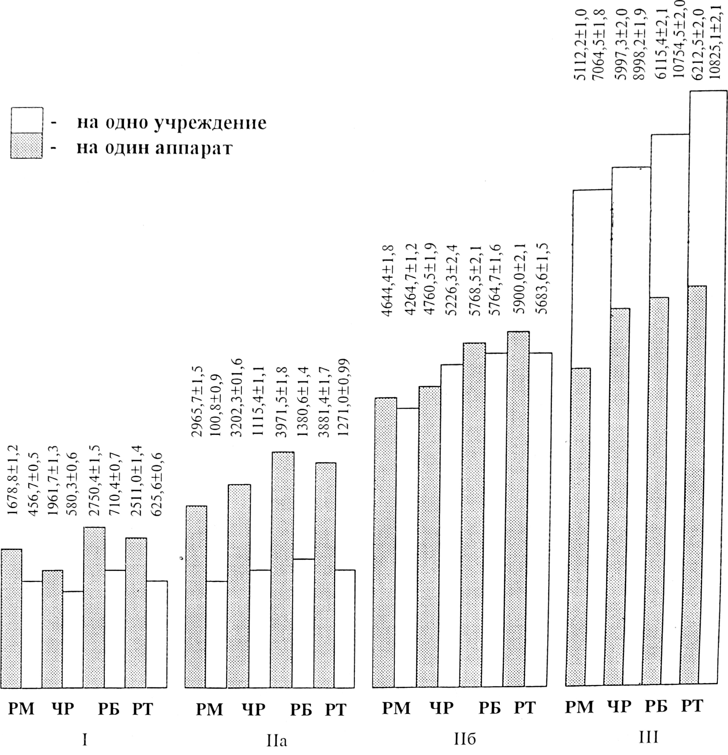 Если по количеству исследований на одно учреждение этапы медицинской помощи отличаются друг от друга в десятки раз, то по количеству обследований, приходящихся на один аппарат, различия не столь велики. Так, показатели третьего этапа (от 5112,4± 1,0 до 6212,5±2,0), хотя и выше, чем второго на уровне городских больниц (от 4644,4±1,8 - Р<0,001 до 5900,0±2,1 - Р<0,001), однако различия в количестве исследований, приходящихся на одно учреждение, составляют 312—468 против 2800— 5142.