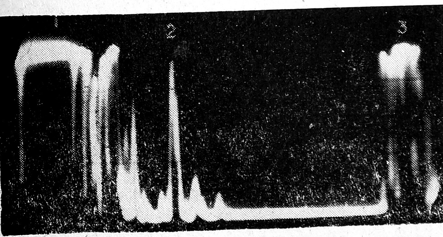 Рис. 1. Хроническая травматическая субдуральная гематома справа. Одномерная эхоэнцефалограмма. Смещение М-эхо влево на 7 мм. 1 — начальный комплекс отраженных сигналов; 2 — М-эхо; 3 — конечный комплекс отраженных сигналов.