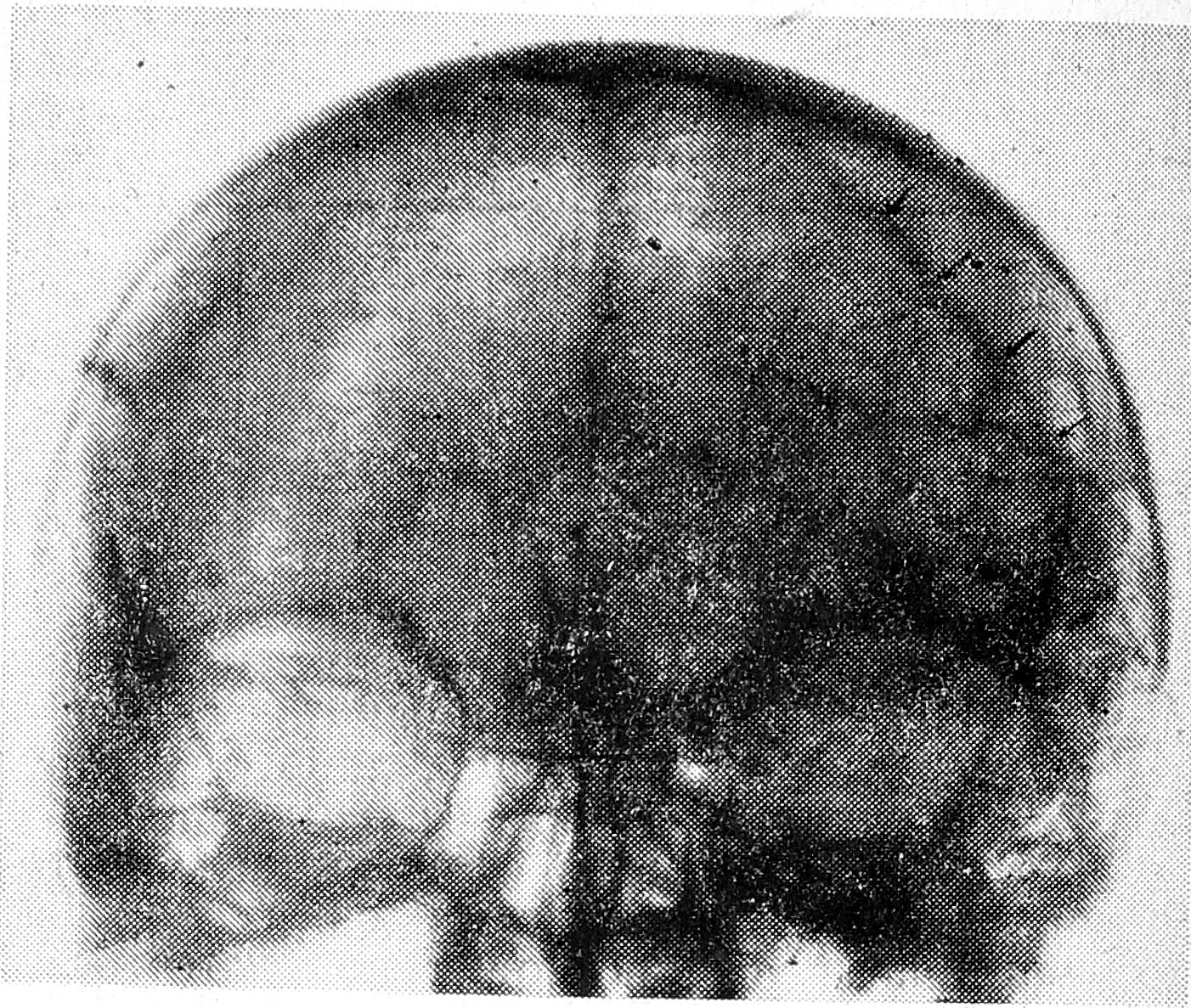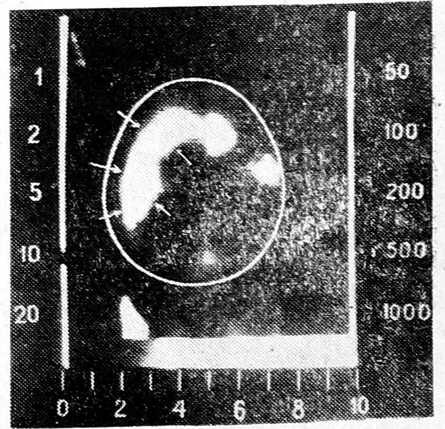 В фазе компенсации наличие хронической субдуральной гематомы может быть установлено с помощью инструментальных методов исследования анатомо-топографического плана, показания к применению которых возникают при установлении в анамнезе факта черепно-мозговой травмы. При одномерной эхоэнцефалографии выявляется смещение М-эхо (рис. 1), при тепловизионном исследовании головы обнаруживается характерный участок повышенного свечения в зоне расположения гематомы (рис. 2). Наличие хронической субдуральной гематомы может быть визуализировано с помощью двухмерной эхоэнцефалографии — по появлению дополнительных сигналов от оттесненных кровью мягких мозговых оболочек и вещества мозга (рис. 3). Диагноз однозначно подтверждается каротидной ангиографией, когда на прямых снимках определяется линзообразная бессосудистая зона с характерным оттеснением сосудов коры мозга (рис. 4).