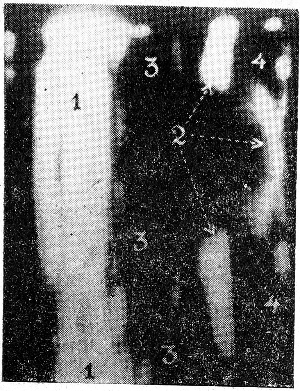 Рис. 3. Хроническая травматическая субдуральная гематома справа. Двухмерная эхоэнцефалограмма. 1 - отраженные сигналы от мягких тканей головы, костей черепа и твердой мозговой оболочки; 2 - отраженные сигналы от мягких мозговых оболочек и вещества мозга; 3 - гематома; 4 - мозговая ткань.
