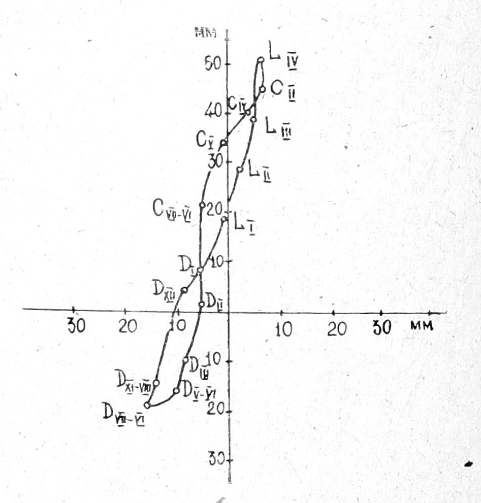 Математическая обработка рентге-носпондилограмм показала, что позвоночник при данной формевертебральной деформации закручивается в полуспираль с высокой амплитудой шага (рис. 1). Это указывает на кратковременность существования данной деформации и на динамический характер возникших биомеханических изменений.