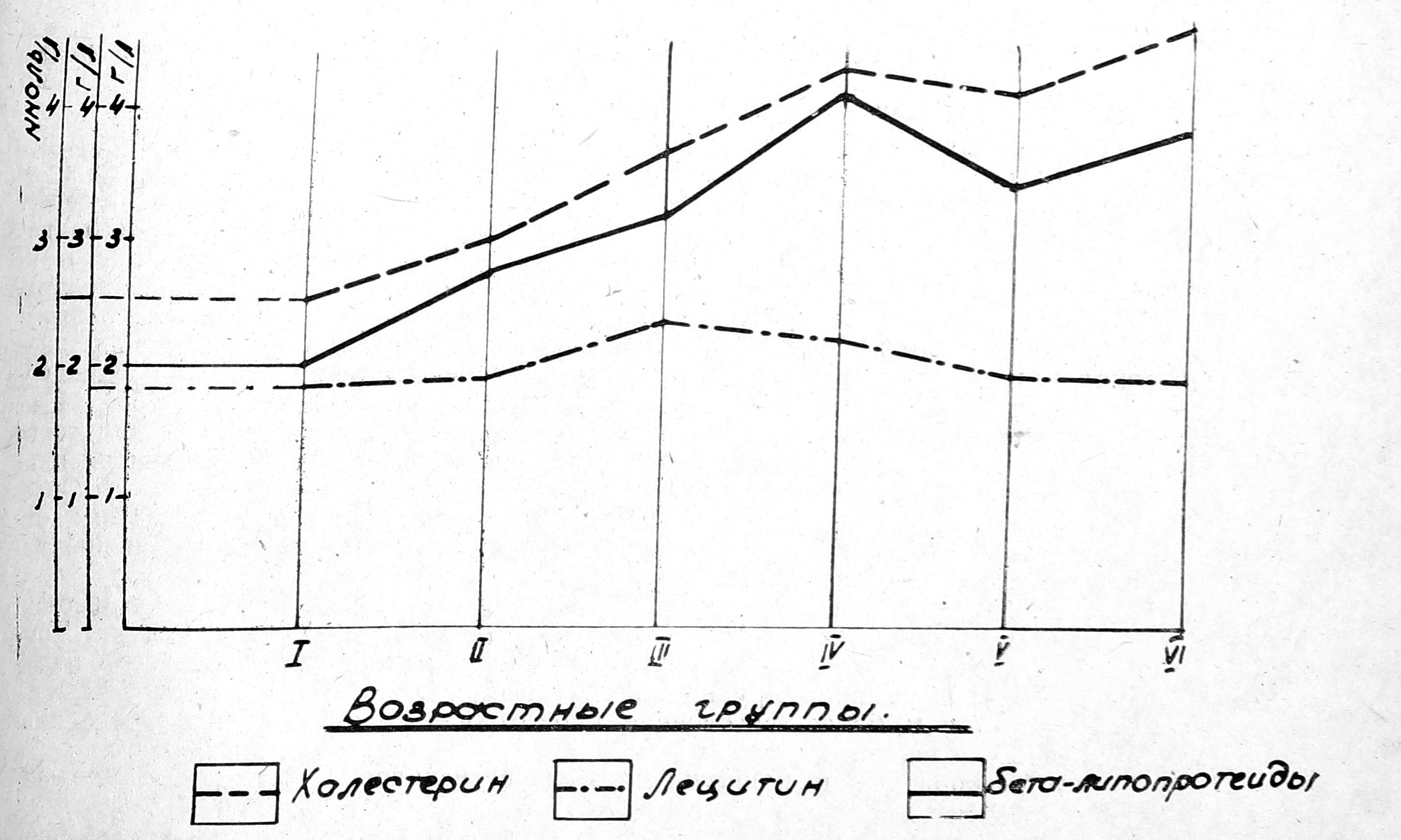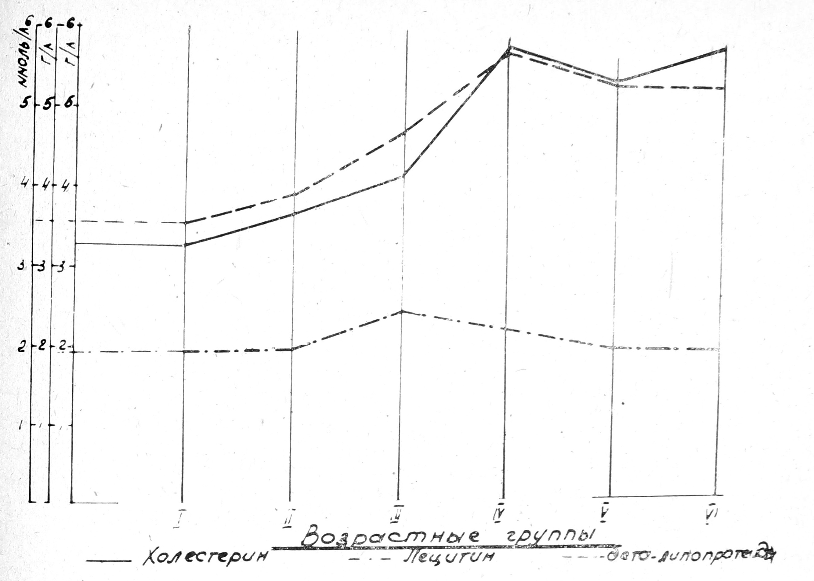 Рис. 2. Возрастные колебания количества холестерина, лецитина и бета-липопротеидов в сыворотке крови больных ИБС.