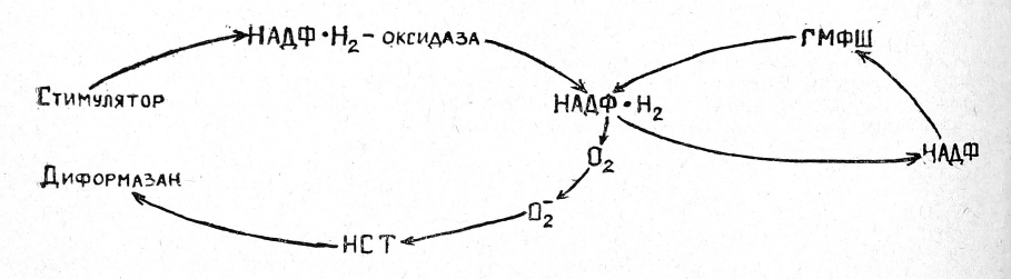 Один из главных механизмов, приводящих к образованию диформазана, можно представить следующим образом (см. рис.). Стимуляция нейтрофила растормаживает НАДФ·H2-оксидазу, которая, окисляя НАДФ·Н2 до НАДФ, активирует гексозомонофосфатный шунт (ГМФШ). По законам внутриклеточного гомеостаза ГМФШ нарабатывает новую порцию НАДФ·Н2, замыкая положительную обратную связь. Электроны, снимаемые с НАДФ·Н2 переводят молекулярный кислород в супероксидный анион, которому принадлежит непосредственная роль в восстановлении НСТ [17]. В целом HCT-тест отражает степень активации кислородзависимого метаболизма нейтрофила, прежде всего функцию ГМФШ и связанную с ним наработку высокореактогенных свободных радикалов.