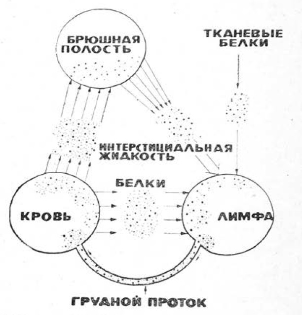 Так, при цовреждениях, сопровождающихся повышением сосудистой проницаемости и накоплением в интерстициальных пространствах и серозных полостях жидкости с высоким содержанием белка при ожоговой и травматической болезни, воспалении органов брюшной полости, аллергической альтерации и др.), в основе метаболических расстройств в паренхиме органов, развития в них серозного воспаления, нарушения гомеостаза крови (гиповолемия и гипопротеинемия и др.) могут лежать недостаточная резорбционная и транспортная функции лимфатического аппарата (см. рис.).