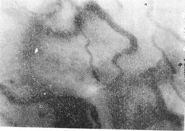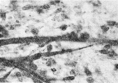 Рис. 1. Растущие капилляры па 3-и сутки после наложения лазерного «сварного» шва на стенку матки. Импрегнация нитратом серебра по В, В. Куприянову. Об. 20, ок. 7.
