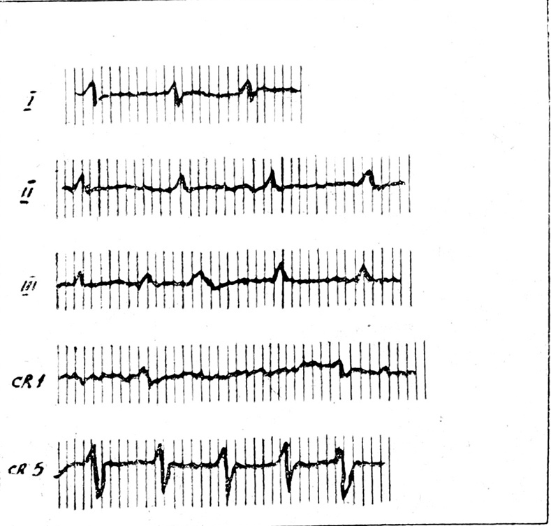 Один из подобных приступов возник во время снятия электрокардиограммы (см. ЭКГ № 2 от 8/Х-55 г.), первое отведение которой зафиксировано еще в период удовлетворительного состояния. В этом отведении QRS = 0,06", QRST = 0,24", RR = 0,30" — 0,45", число сердечных сокращений — 200—133 в минуту, форма желудочковых комплексов однообразна.