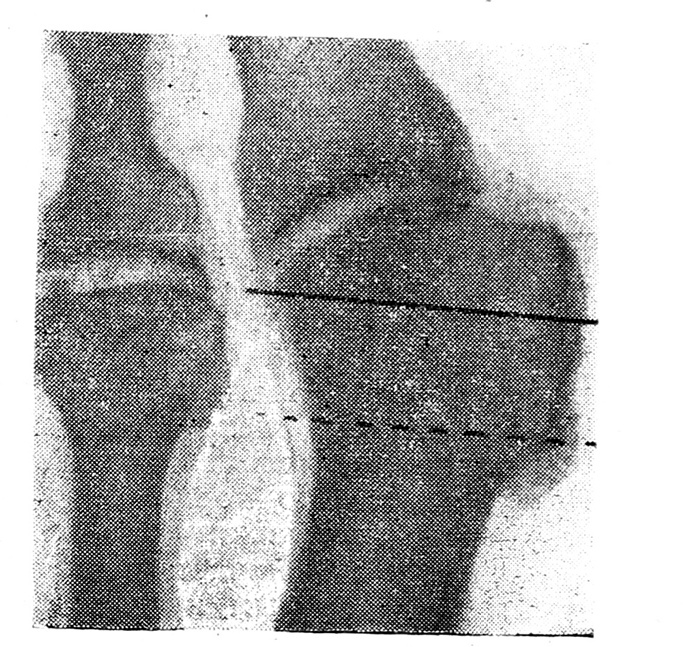 Мы видоизменили этот способ. Головку I плюсневой кости удаляем не у ее основания вместе с экзостозом, как рекомендовал Р. Р. Вреден (рис. 1), а только часть ее, покрытую хрящом, а экзостоз скусываем дополнительно. Удаление головки производится не щипцами Листона, а пилкой Джигли. По нашим наблюдениям, удаления только хрящевой части головки вполне достаточно для разгрузки мышц большого пальца и его коррекции в нормальном положении, кроме того — сохраняется точка опоры на вновь образованный I плюсне-фаланговый сустав. Спиливание головки ускоряет операцию, оно менее травматично, не оставляет даже мельчайших костных шипов, остающихся при скусывании и травмирующих хрящевую поверхность 1 фаланги, вызывая тем значительные боли.