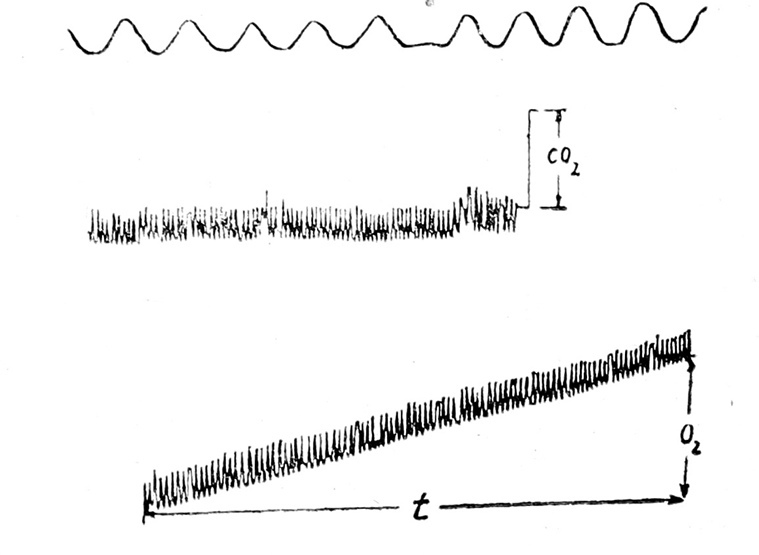 По инструкции количество выделившегося при дыхании СО2 определяется при работе аппарата с выключенным химическим поглотителем СО2, так как пропорционально времени в системе происходит накопление СО2, выдыхаемой пациентом. Через некоторое время различное и зависящее от особенностей исследуемых выделение СО2 на спирограмме выявляется учащением ритма, расширением амплитуды дыхания, а при Чейн-Стоксовском дыхании — дыхательными движениями в периоды апное. Путем простого арифметического подсчета можно с известной степенью достоверности судить о пороге возбуждения дыхательного центра избытком СО2. Например, после исследования процента выделившейся при дыхании в течение 10 мин СО2 оказалось, что за 10 мин выделилось 2 л СО2, а явления стимуляции дыхательного центра наступили на 6-й мин (в первые секунды 6-й минуты).