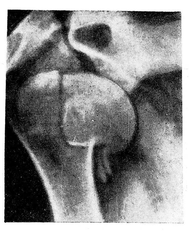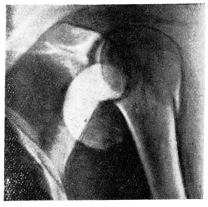 Примером может слуякить И., 56 лет, которой предпринято вправление перелома-вывиха правого плеча под эфирным наркозом. Но и после репозиции сохранился значительный подвывих в суставе (рис. 1). После снятия гипса в течение 3 месяцев проводилась энергичная физиомеханотерапия, в результате чего наступило полное восстановление функции.