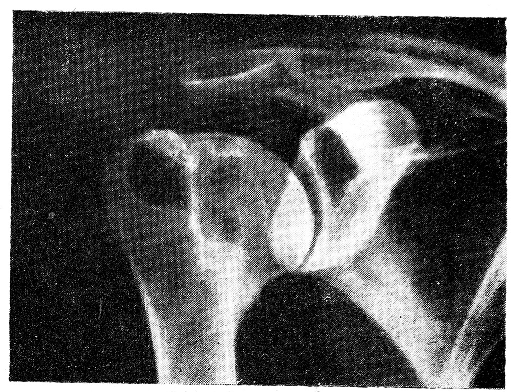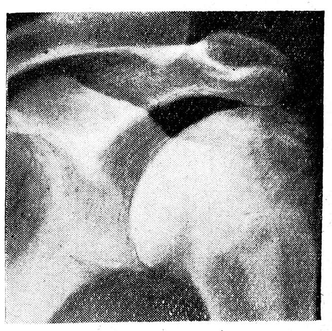 Больному К., 34 лет, после безуспешных попыток консервативного вправления перелома-вывиха левого плеча с отрывом большого бугорка (рис. 3) произведена кровавая репозиция. После снятия гипсовой повязки занимался гимнастикой, получал грязелечение. Через 5 месяцев после травмы приступил к работе по специальности электромонтажника-верхолаза.