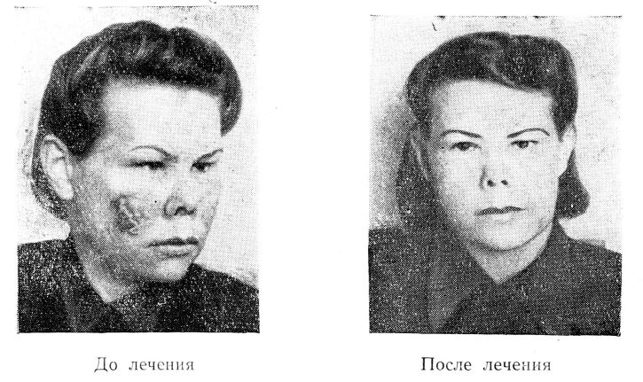 Клиническим излечением мы считали такой результат, когда болезненный процесс на коже исчезал бесследно, резким улучшением — когда шелушение кожи исчезало, инфильтрат рассасывался, но небольшая краснота оставалась, улучшением — если, кроме красноты, оставался незначительный инфильтрат на очаге поражения кожи. Из семи больных, лечившихся изотопом фосфора и инъекциями кризанола, наступило клиническое излечение у четырех, резкое улучшение — у двух и улучшение — у одной больной. Из двух больных, лечившихся радиоактивным изотопом фосфора и инъекциями биохинола, у одной наступило резкое улучшение, а у другой — улучшение. У больной, лечившейся радиоактивным фосфором и акрихином, наступило резкое улучшение.