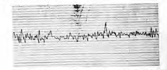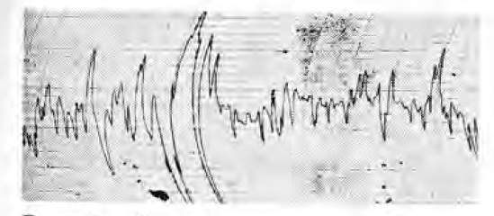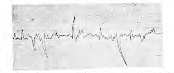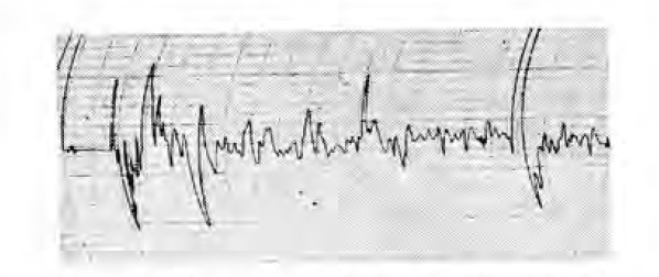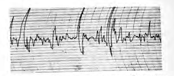 При повышенной интенсивности биопотенциалов матки у женщин с шеечным тонусом в 5 — 7 баллов среднее значение ее составило 0,170 ± 0,056 усл. ед., что было выше показателя нормальной интенсивности при том же шеечном тесте (Р<0,01). При шеечном тесте в 8—10 баллов повышенный тип интенсивности биопотенциалов оказался равным 0,260 ± 0,028 усл. ед., то есть в два раза выше показателя нормоіинтенсивности биопотенциалов при том же шеечном тесте. Гиперинтенсивность биопотенциалов матки при шеечном тесте в 11—13 баллов характеризуется средним значением, равным 0,370 ± 0,018 усл. ед., которое выше, чем при шеечном тесте в 8—10 баллов (Р<0,01). При любом шеечном тесте повышенная интенсивность биопотенциалов матки выражается мощными колебаниями 1-го порядка с амплитудой более 1 мВ и периодом в 1—1,5 мин. На этом фоне видны усиленные колебания 2-го порядка с амплитудой до 1 мВ и периодом в 0,2—0,3 мин. Отмечается также чрезмерно выраженная реакция на внутривенное вливание 10 мл 10% раствора хлористого кальция (рис. 5).