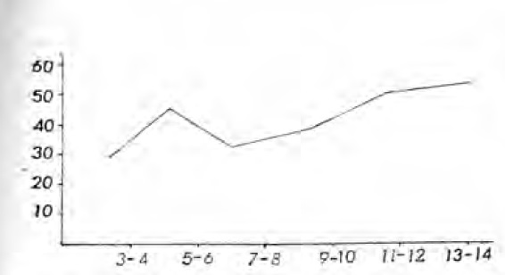 Возрастные особенности частоты метеочувствительности у детей с заболеваниями органов пищеварения. По оси ординат — частота метеочувствительности, % ; по оси абсцисс — возраст (лет).
