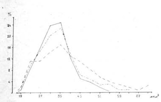 Рис. 1. Вариационные кривые размеров ядер гепатоцитов. По оси абсцисс — классы размеров ядер, равные их площади, по оси ординат — содержание ядер каждого класса в процентах. Сплошная линия — контроль, прерывистая — механическая желтуха на фоне желчнокаменной болезни, пунктирная — обструкция холедоха опухолевыми образованиями.