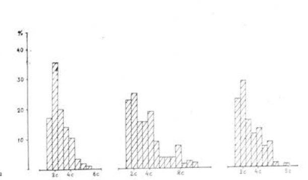 Рис. 2. Гистограммы содержания ДНК в ядрах гепатоцитов. 1 — контроль, 2 — механическая желтуха на фоне желчнокаменной болезни, 3 — внепеченочная желтуха опухолевого генеза. С—количество ДНК в гаплоидном наборе. По оси ординат — содержание ядер каждого класса в процентах.