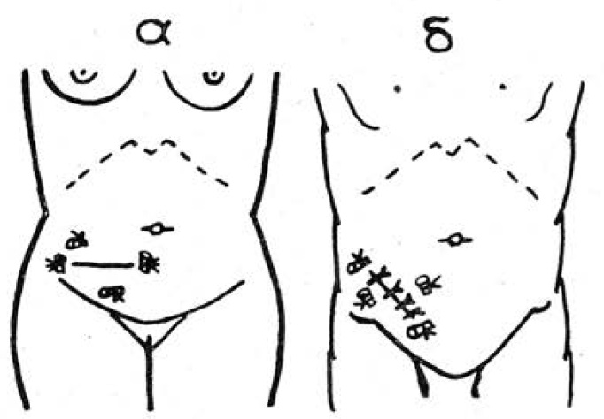Поперечный разрез при аппендэктомиях мы производим по кожной складке на середине между пупком и подлобковой складкой. Сухожилия наружной косой мышцы рассекаем по ходу волокон, так как разъединение разнородных тканей и их последующее послойное соединение в разных плоскостях и направлениях обеспечивают оптимальные условия для заживления раны. Следовательно, упомянутые доступы в нашем применении отличаются друг от друга лишь направлениями кожных разрезов. Брюшную стенку ушиваем методом беспрерывного съемного монофиламентного (БСМ) шва. В качестве шовного материала используем монофиламентную капроновую нить диаметром 0,4 мм.