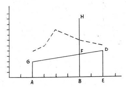 Схема для вычисления величин С1, Сm С1—m (вариант а). По оси абсцисс — месяцы, по оси ординат — показатели заболеваемости на 100 000 человек; ВН — граница двух смежных годов; пунктиром обозначена кривая заболеваемости; величина AG равна p1 величина ED равна p2, расстояние АВ равно значению п1, расстояние BE— значению 1—m, расстояние АЕ значению 1. Величина р1 здесь относится к году начала сезонного периода, а р2 к году его окончания. Сm учетом того, что величина р меняется по годам, расчет величины необходимо проводить по двум вариантам: а) если р1 меньше р2, то в этом случае Cm=(
