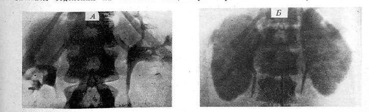 Рис. 2. Рентгенограммы поясничной области В., 36 лет. А— по данным инфузионной урограммы и бактериологических исследований поставлен диагноз: туберкулезный папиллит обеих почек с преимущественным поражением правой. Длительная антибактериальная терапия оказалась неэффективной, возникло сомнение в форме поражения. Б — нефрографическая фаза почечной ангиографии у этой же больной. Окончательный диагноз: кавернозный туберкулез верхнего сегмента правой почки. Произведена резекция верхнего сегмента правой почки, подтвердившая предоперационный диагноз. Гладкое послеоперационное течение. Выздоровление.