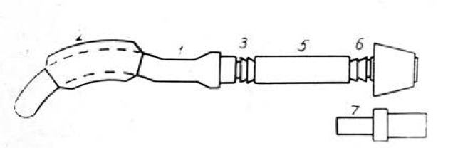 Обозначения: 1 — воздуховод, 2 — надувная манжета, 3 и 4 — коннекторы для воздуховодов, 5 — соединительная резиновая трубка, 6 и 7 — коннекторы к адаптеру.