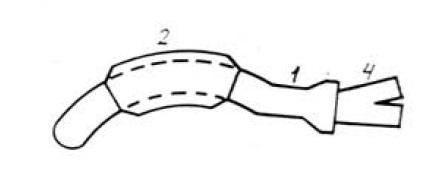 Вводный наркоз осуществляем азеотропной смесью через маску наркозного аппарата до достижения IIIs стадии по Гуеделу. Далее маску снимаем и в полость рта ребенка вводим резиновый ротоглоточный воздуховод с наклеенной на его поверхность циркулярно резиновой манжетой. Последняя раздувается анестезиологом через резиновую с просветом в 2—3 мм канюлю длиной 15—20 см до соприкосновения со стенками ротовой полости пациента. На наружный конец канюли для герметизации манжеты накладываем зажим. Располагаясь на средней трети поверхности ротоглоточного воздуховода сзади зубов ребенка, манжета оставляет свободным дистальный конец его и не увеличивает зону раздражения корня языка, гортани и глотки. Адаптер наркозного аппарата через коннекторы и короткую резиновую трубку соединяем с воздуховодом (рис. 1). Носовые ходы закрываем носовым зажимом.