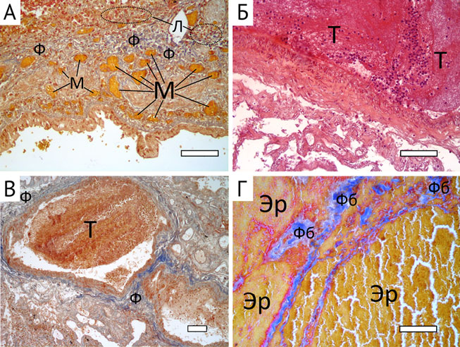 Рис. 1. Гистологические изображения с дисциркуляторными изменениями в образцах тканей лёгких пациентов, умерших от COVID-19. А. Эритроцитарные микротромбы (М); очаговый фиброз (Ф); лейкоцитарная инфильтрация (Л). Окраска по методу пикро-Маллори, линейка 100 мкм. Б. Пристеночный тромб (Т), содержащий фибрин и лейкоциты. Окраска гематоксилином и эозином, линейка 100 мкм. В. Обтурирующий тромб (Т) с обилием лейкоцитов в мелкой ветви лёгочной артерии; периваскулярный фиброз (Ф). Окраска по методу пикро-Маллори, линейка 100 мкм. Г. Лёгочный тромбоэмбол с чередованием «старого» (синего цвета1) фибрина (Фб) и эритроцитов (Эр). Окраска по методу пикро-Маллори, линейка 100 мкм