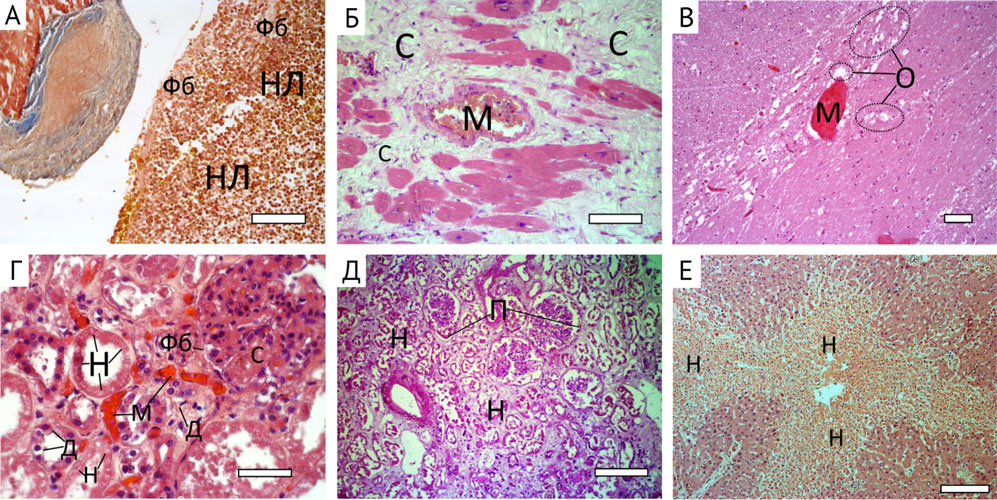 Рис. 3. Гистологические изображения аутопсийных образцов сердца (А, Б), головного мозга (В), почек (Г, Д) и печени (Е) пациентов, умерших от COVID-19. А. Полость сердца с тромбом из фибрина (Фб) и нейтрофильных лейкоцитов (НЛ). Окраска по методу пикро-Маллори, линейка 100 мкм. Б. Микротромбы (М) в просвете сосуда; крупноочаговый кардиосклероз (С), дистрофия кардиомиоцитов. Окраска гематоксилином и эозином, линейка 100 мкм. В. Микротромб (М), состоящий из эритроцитов; отёк головного мозга (О). Окраска гематоксилином и эозином, линейка 100 мкм. Г. Эритроцитарные микротромбы (М); некротический нефроз (Н); паренхиматозная очаговая дистрофия канальцевого эпителия (Д); минимальные признаки гломерулосклероза (С); фокальные отложения фибрина (Фб) в мочевом пространстве клубочка. Окраска гематоксилином и эозином, линейка 50 мкм. Д. Белковые «полулуния» (П) в мочевом пространстве клубочка на фоне острого тубулярного некроза (Н). Окраска гематоксилином и эозином, линейка 200 мкм. Е. Центролобулярные некрозы (Н) в печени. Окраска гематоксилином и эозином, линейка 200 мкм