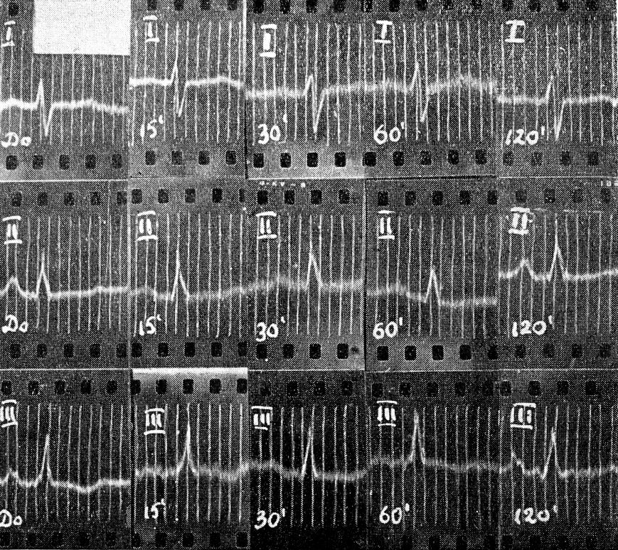 Кроме того, у 7 больных изучалась динамика ЭКГ в течение часа после внутривенного введения строфантина в дозе 0,25 мг. Только в одном случае отмечено снижение зубцов Р2 — Р3.
