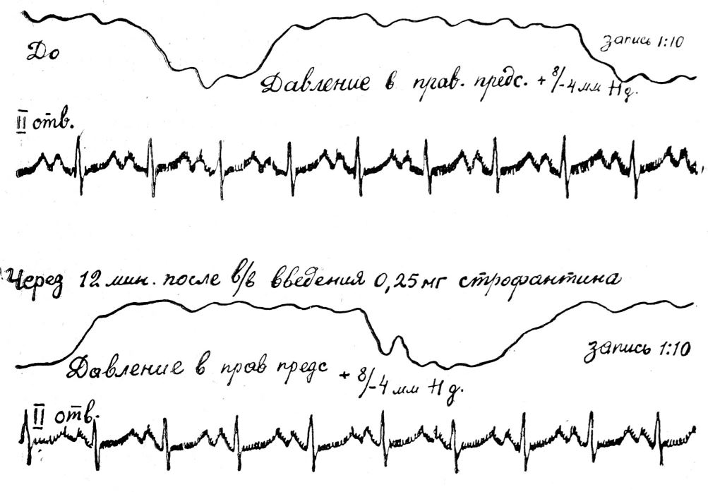 Однако, проведенное нами у 3 больных зондирование правого сердца, с введением в вену или непосредственно в полость сердца 0,25 мг строфантина-К, обладающего, как известно, бесспорным инотропным влиянием на миокард, не обнаружило ни снижения давления в правом предсердии, ни характерных сдвигав ЭКГ в течение 5—15 мин (рис. 2).