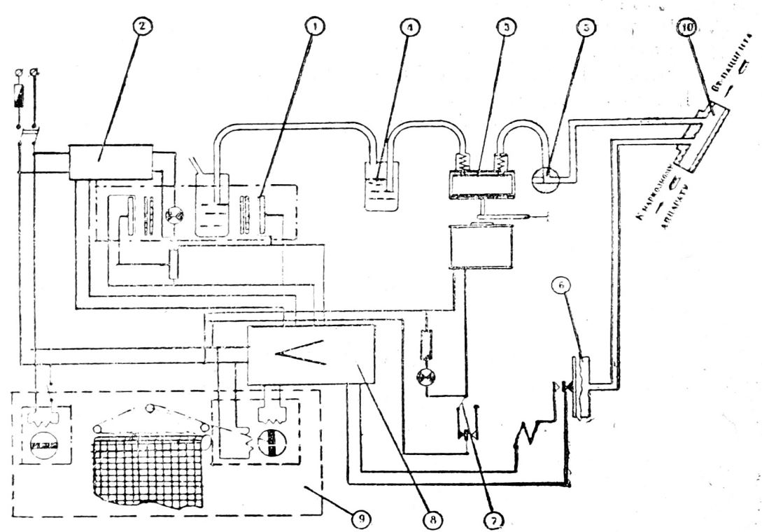 Рис. 2. Принципиальная схема 1. Фотодатчик. 2. Феррорезонансный стабилизатор. 3. Мембранный насос. 4. Увлажнитель. 5. Трехходовой кран. 6. Мембранное реле. 7. Переключатель насоса на искусственное и естественное дыхание. 8. Усилитель. 9. Самопишущий механизм. 10. Переходник к наркозному аппарату