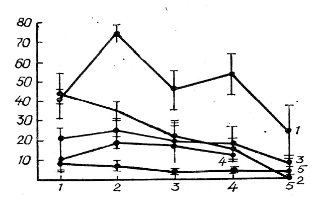 Рис. 1. Кинетика протока человека: КБА, 4 — дизентерии, 5 — контроль антигенной стимуляции). По оси абсцисс — сроки исследования (в сут), по оси ординат — среднее количество бластов (в %).