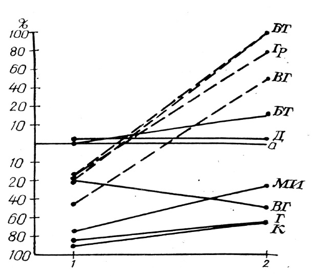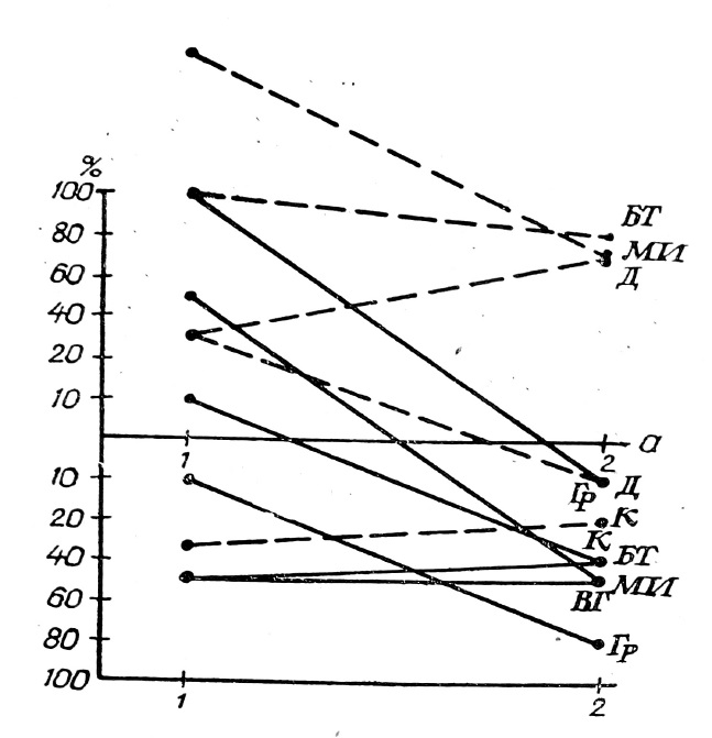 Рис. 2. Показатели бласттрансформации на ФГА (сплошная линия) и ППД (пунктир) при брюшном тифе (БТ), дизентерии (Д), менингококковой инфекции (МИ), вирусному гепатите (ВГ), гриппе (Г) и кори (К). а — контроль, 1 — острый период болезни, 2 — период выздоровления. оси абсцисс — сроки исследования, по оси координат—средняя разница с контролем.