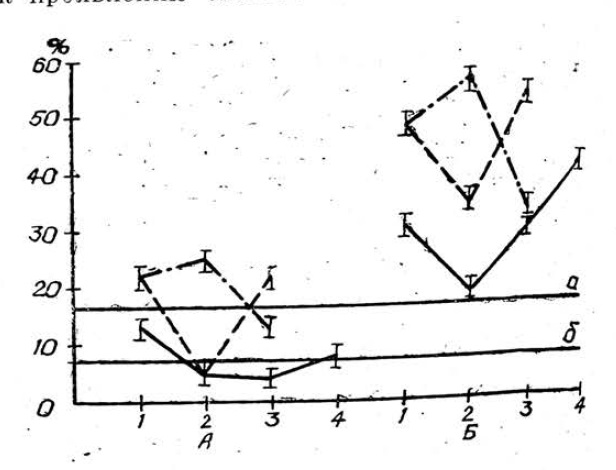 Рис. 4. Показатели HCT-теста при лечении левомицетином больных брюшным тифом (сплошная линия) и дизентерией (пунктир), при лечении химиопрепаратами больных дизентерией (пунктир с точкой). 1 — до лечения, 2 — на фоне лечения, 3, 4 — 1 и 2-я недели после отмены препарата, а — контроль (стимулированные нейтрофилы), б — контроль (нестимулированные нейтрофилы). По оси абсцисс: А — нестимулированные нейтрофилы, Б — стимулированные нейтрофилы, по оси ординат — средние показатели НСТ-теста