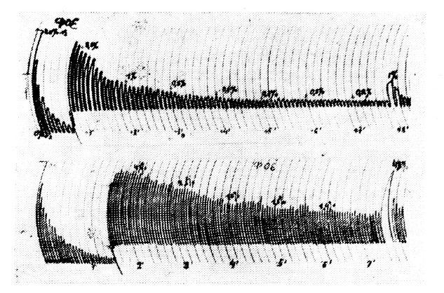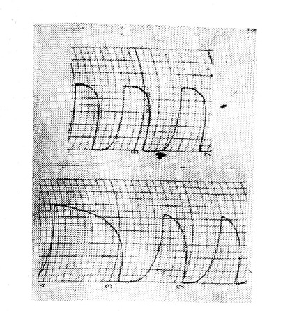 Рис. 1. Вверху: капнограмма больного митральным стенозом с недостаточностью II степени. Концентрация CQ2 на протяжении выдоха альвеолярного воздуха на увеличивается. Внизу: капнограмма больного, хроническим бронхитом с легочной недостаточностью II степени. Концентрация СО2 на протяжении выдоха альвеолярного воздуха непрерывно растет.