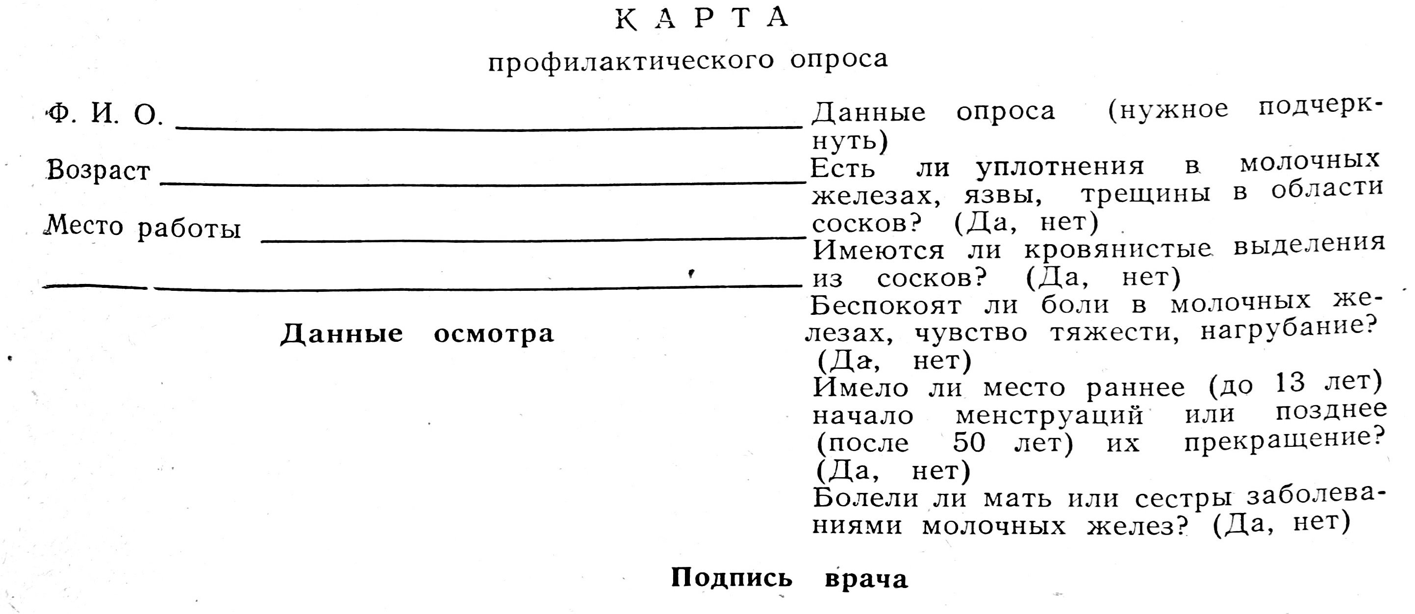 Онкологом осмотрены 90 женщин, ответивших положительно хотя бы на один вопрос карты профилактического опроса. Заболевания молочных желез выявлены у 14 (15,6%) женщин (у 11—диффузная мастопатия, у 2 — фиброаденомы, у 1 — киста молочной железы). Число больных с заболеваниями молочных желез оказалось в 2 раза больше, чем при профосмотре на этом же предприятии, проведенном нами ранее без применения карт профилактического опроса.