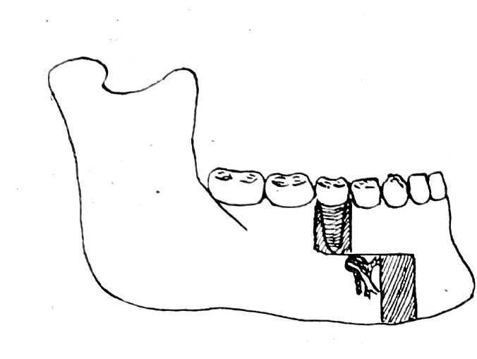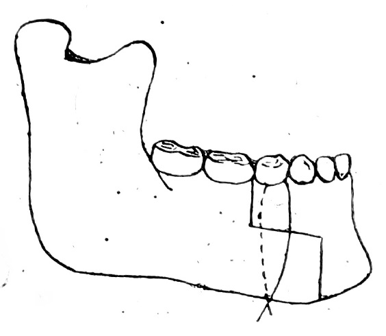Нами предложен метод внутриротовой остеотомии. Под общим обезболиванием со стороны преддверия полости рта и с язычной стороны производим трапециевидный разрез слизистой оболочки полости рта. Распатором отсепацовываем слизисто-надкостничный лоскут. Удаляем второй премоляр или первый моляр в зависимости от выраженности прогении. Циркулярной пилой выпиливаем часть челюсти в виде прямоугольника (глубина распила равна уровню лунки). Второй прямоугольник челюсти выпиливаем впереди ментального отверстия после горизонтального распила челюсти, соединяющего два прямоугольника (рис. 1).