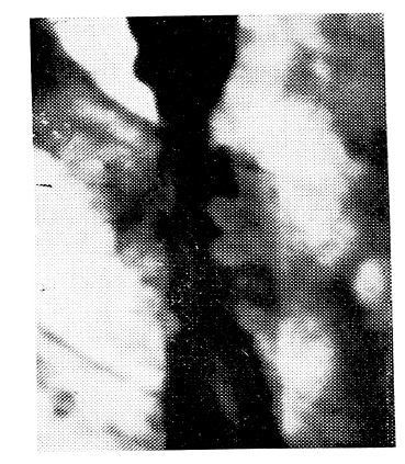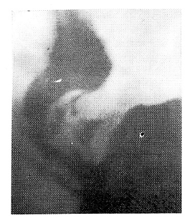 Рис. 1. Рентгенограмма дистальных сегментов пищевода и верхнего отдела желудка больного К. в горизонтальном положении на спине с небольшим поворотом в первое косое положение. На переднелевой стенке абдоминального сегмента пищевода, расположенного в заднем средостении, определяется «ниша» размером около 0,8 см в диаметре с выраженным воспалительным валом вокруг и конвергенцией к ней отечных складок слизистой.