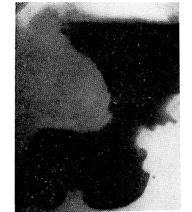 Рис. 1. В., 51 года. Исследование в условиях искусственной гипотонии. Тело желудка сужено, по малой кривизне — плоская «ниша», по большой кривизне — неправильной формы дефект наполнения, на фоне которого также видна тень «ниши» (смешанная изъязвленная опухоль).