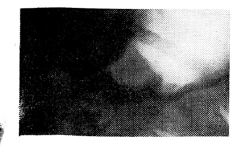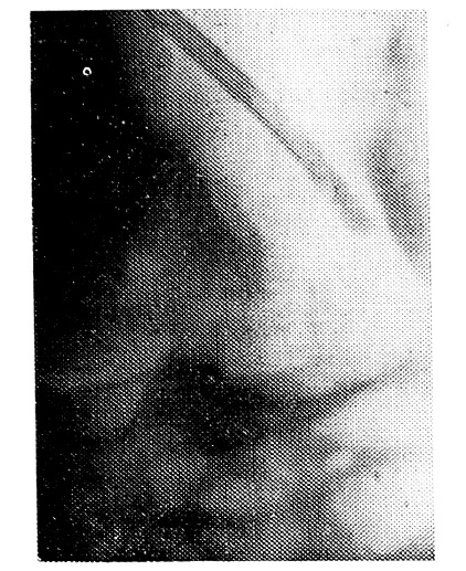 А., 53 лет, поступил в клинику с подозрением на рак желудка. Рентгенологическое исследование (рис. 3): складки слизистой обрываются в теле желудка у проксимальной границы чашеобразной опухоли, имеющей диаметр 7 см, размеры изъязвления — 3,5X4,ОХ 1,7 см. От кардиального жома до проксимальной границы новообразования— 4 см, от привратника до дистальной границы его — 4 см. Перистальтика видна лишь в антральном отделе. Эвакуация свободная. После стимуляции перистальтики диадинамическими токами дополнительных данных не получено. Пневмогастрография (рис. 4): видна тень чашеобразной опухоли, занимающей частично тело и антральный отдел, в проксимальном направлении от нее вплоть до пищевода обнаруживается утолщение стенки желудка до 1 см. Заключение: смешанная изъязвленная опухоль желудка.