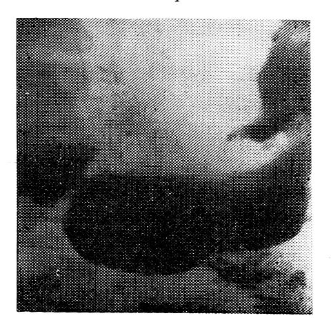 Рис. 2. То же наблюдение. Пневмогастрография: просвет желудка сужен, на этом уровне по большой кривизне видна тень экзофитного компонента опухоли с большим изъязвлением в центре.
