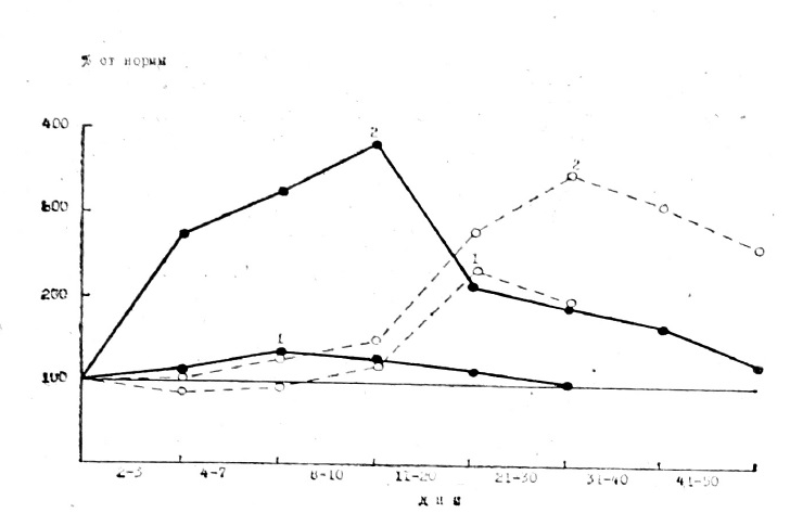 Как при остротекущих, так и при затяжных пневмониях (см. табл.) констатировано повышение концентрации общих гексоз сыворотки крови, гексоз гликопротеидов, начиная со 2—3-го дня заболевания (Р<0,001). Увеличения экскреции ГАГ с мочой в эти же сроки и в последующие 3—4 дня у больных обеих групп не отмечалось (Р<0,2 и Р>0,5). Повышение уровня ГАГ мочи 0,001) начиналось с 8—10-го дня при затяжном течении и с 11-го дня — при остротекущих пневмониях. Наибольший уровень гипергликозаминогли- канурии зарегистрирован к 21—30 и 11 — 20-ым дням соответственно (см. рис.).