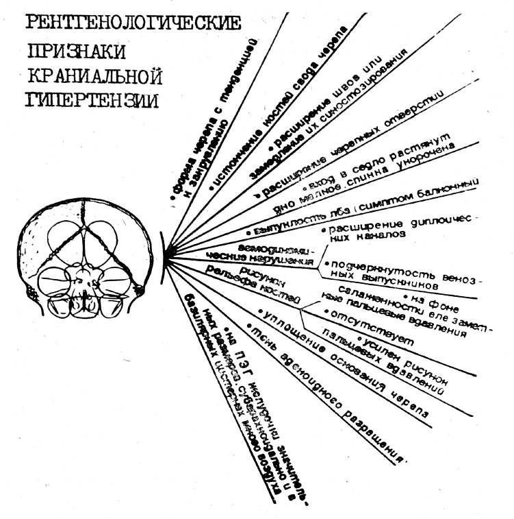 Рентгенологические признаки интракраниальной гипертензии можно определить на краниограммах, пневмоэнцефалограммах (ПЭГ), пневмовентрикулограммах (ПВГ) и ангиограммах. Из них наиболее доступными являются краниограммы. Кроме того, они достаточно информативны и не связаны с хирургическими манипуляциями.