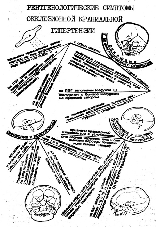 Таким образом, внутричерепная гипертензия в целом всегда является следствием участия привходящего инфекционного фактора или какой-либо другой болезни, которые ведут к срыву установившегося внутричерепного давления. Поэтому наблюдаются компенсированные, субкомпенсированные фазы краниостенозов. В выявлении признаков внутричерепной гипертензии существенное значение имеет рентгенологическое исследование, включающее краниографию, пневмоэнцефало- и пневмовентрикулографию, а также церебральную ангиографию. Среди них наиболее информативна целенаправленно и методически правильно проведенная краниография.