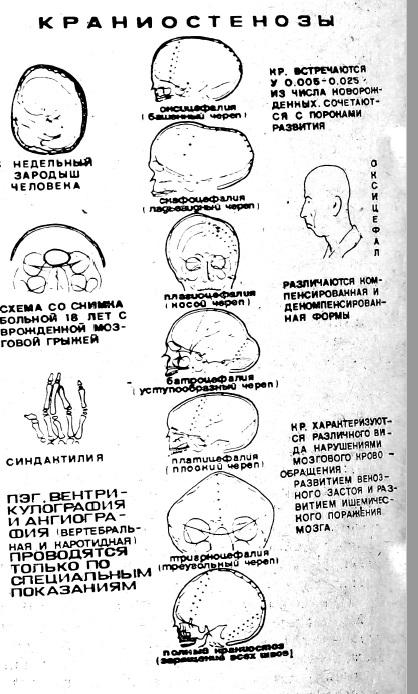 При преждевременном синостозировании венечного и сагиттальных швов возникает оксицефалия (башенный череп), сагиттального шва—скафоцефалия (ладьевидный череп), сагиттального и лямбдовидного швов на одной стороне—плагиоцефалия (косой череп), лямбдовидного шва — батроцефалия (уступообразный череп), венечного шва — платицефалия (плоский череп), заращение всех швов обусловливает полный краниостеноз (на рис. 3 заращенные швы обозначены точками). При краниостенозе всегда имеет место краниальная гипертензия, которая в большинстве случаев носит зональный характер.