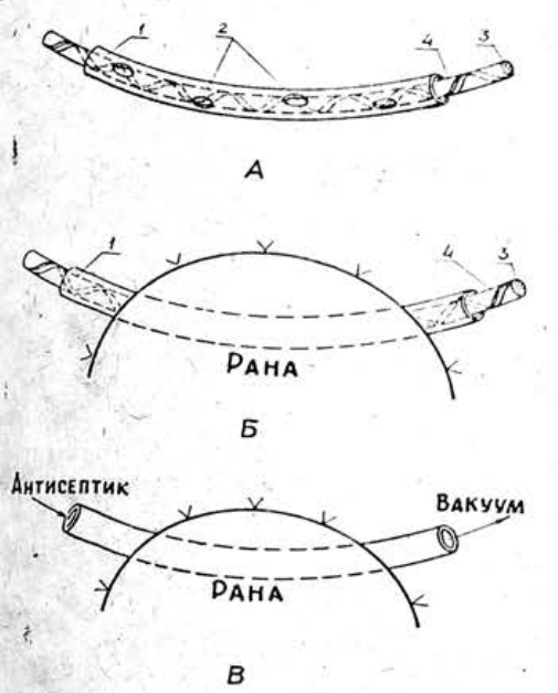 принцип работы дренажа заключается в следующем: сразу же после операции несвернувшаяся кровь (раневое отделяемое) вытекает из раны по спиральной выемке 4 мандрена 3. После того, как кровь свернется и закупорит выемки мандрена, последний удаляют из дренажной трубки. При необходимости рану промывают растворами антисептиков, антибиотиков и производят ее вакуумирование. Для этого после удаления мандрена к одному концу трубки подводят промывающий раствор, а к другому подключают вакуум-отсос (В). При вакуумировании без промывания свободный конец дренажной трубки закрывают стерильной салфеткой для предотвращения подсоса окружающего воздуха в рану. Спиралевидный ход выемки мандрена способствует полному удалению свернувшейся крови из дренажной трубки.