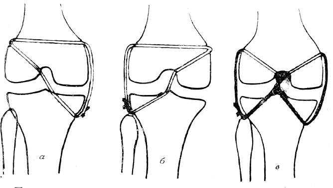 Пластика связок коленного сустава по кольцевидному способу: а — передней крестообразной и внутренней боковой; б — задней крестообразной и наружной боковой; в—передней и задней крестообразной, внутренней и наружной боковой («кольцевидная восьмерка»).