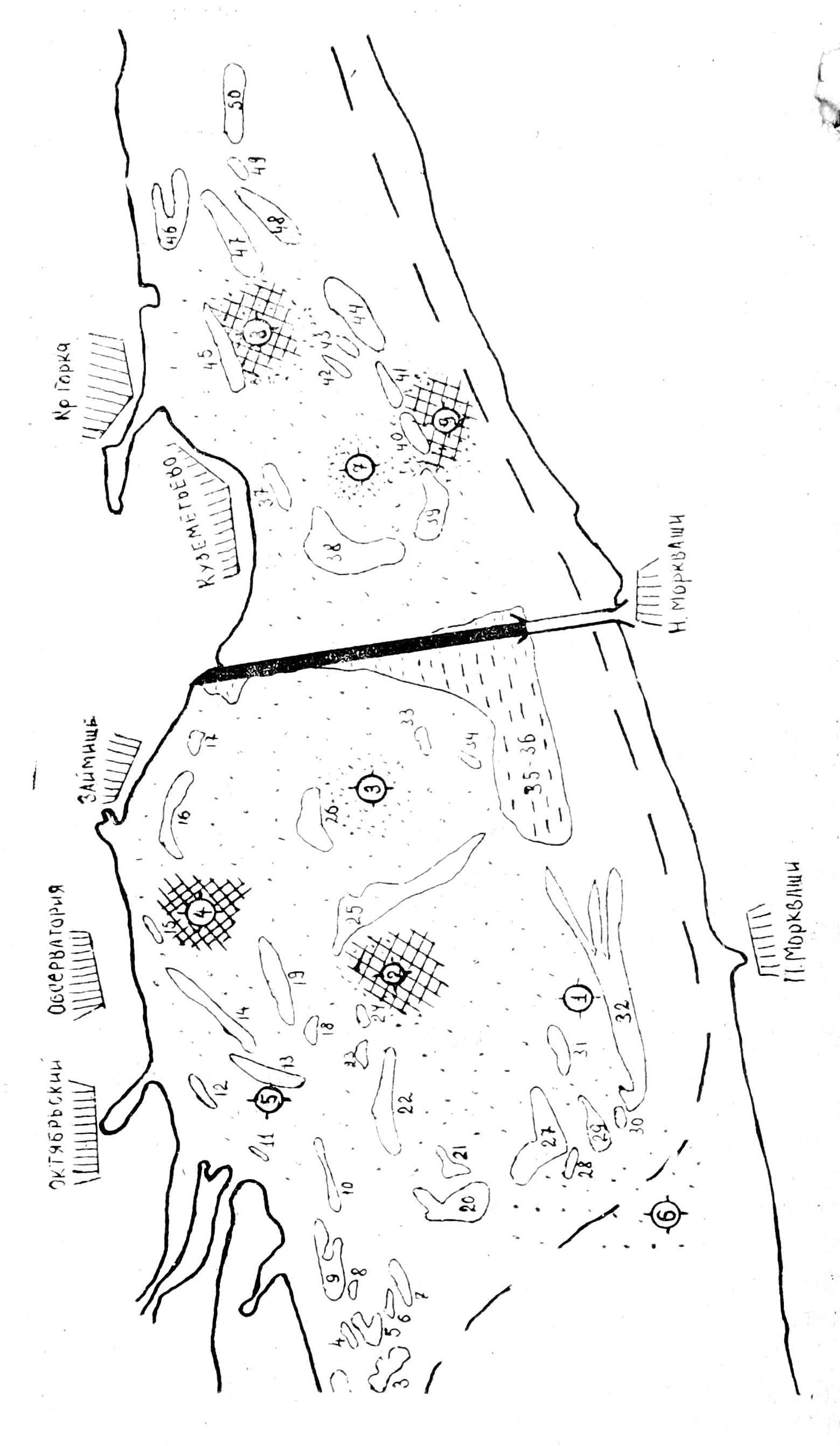 Схема островных систем в районе автомоста через Волгу. Условные обзначения: замкнутый участок, заштрихованный прерывистыми линиями — искусственные песчаные намывы, различные конфигурции с цифрами посередине — острова, занятые дачными обществами, окружности с 4 перпендикулярами — станции — места забора биопроб, прерывистые линии — судовой ход; участки, заштрихованные редкими точками,— места слабой загрязненности, а заштрихованные точками интенсивно,—повышенной загрязненности, перекрестными линиями — высокой загрязненности.
