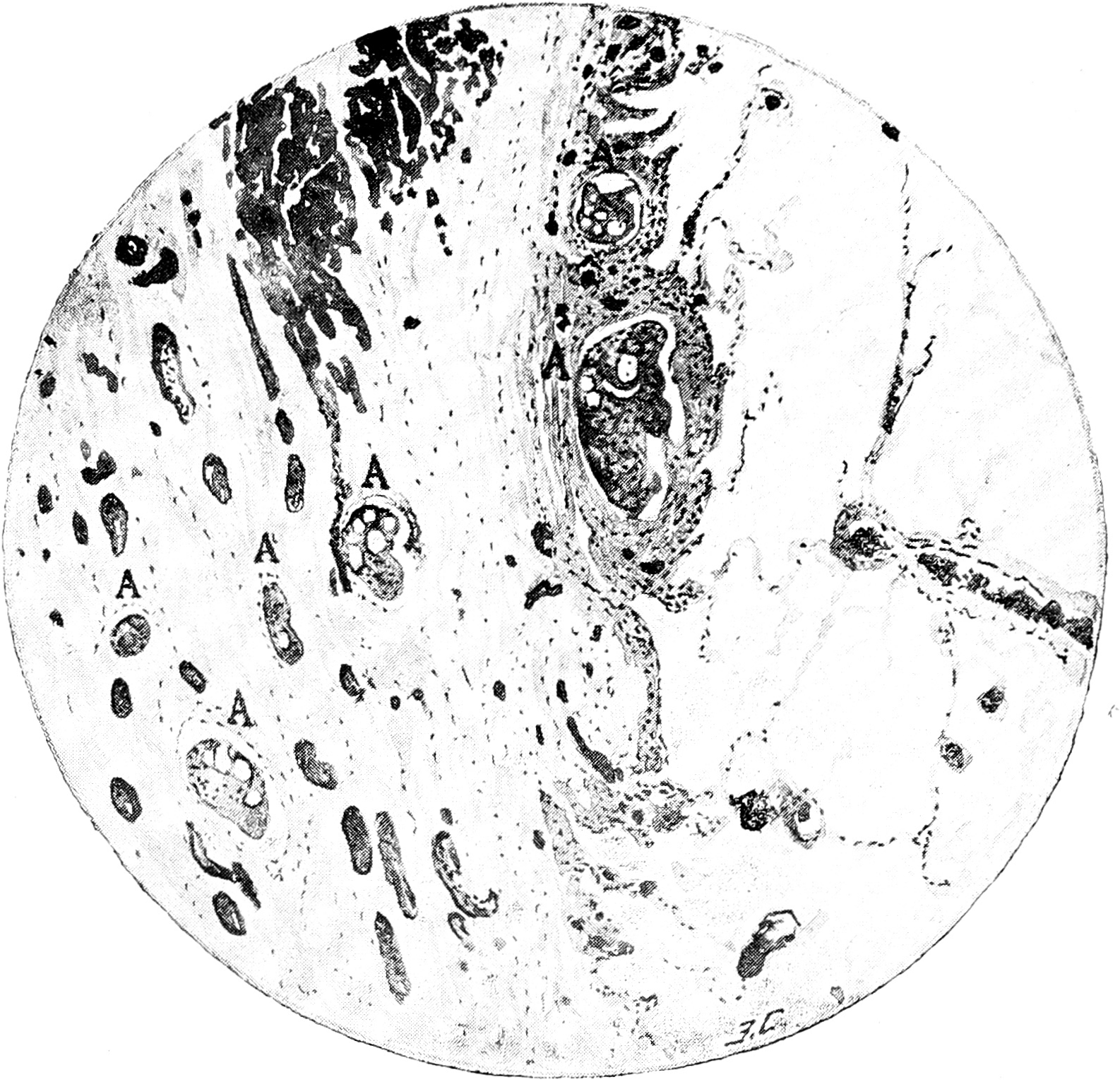 „Под микроскопом новообразование состояло из пучков соединительной ткани, между которыми заложены гнезда клеток неправильной формы, иногда полигональной, кругловатой или несколько уплощенной, напоминающей собою клетки эндотелия лимфатических сосудов. В большинстве клеток ядра велики, редко попадаются в них ядрышки, протоплазмы незначительное количество. В клетках мелких гнезд протоплазмы больше, она мелкозерниста и заключает в себе часто по 2 ядра. В глубоких слоях новообразования гнезда представляют собою несколько расширенные лимфатические пространства, в которых клетки эндотелия увеличены в количестве. Идя постепенно к периферии, пространства и количество клеток новообразования в них увеличиваются. В самых поверхностных слоях клетки подверглись жировому перерождению и частью выпали из своих полостей, так что остаются лишь одни перекладины в виде различной толщины пучков волокнистой ткани. Сосудов довольно много“.