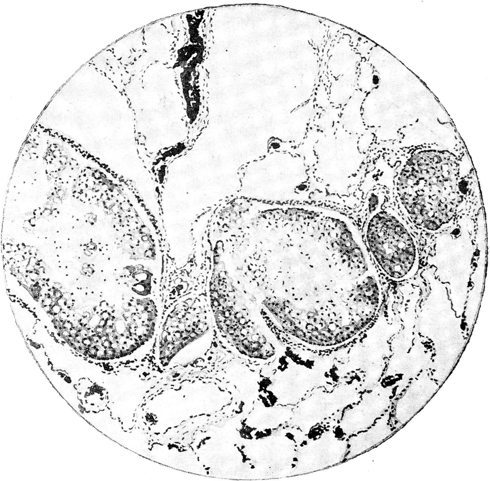 Нам не удалось в своем случае констатировать разростания опухоли на поверхности плевры, а, следовательно, и видеть т. наз. перехода покровного эпителия в элементы новообразования. Кроме того, если бы и наблюдались такие картины, то, по нашему мнению, они также скорее всего могли говорить о склонности клеток новообразования обростать свободные поверхности (Ribbert), чем за переход клеток в опухоль. Не возражая принципиально против выставленных Krumbein’ом доказательств (тем более, что наш случай по своей гистологической картине наиболее близко подходит к случаю этого автора), мы не решаемся, однако, на основании таких побочных доказательств окончательно высказаться относительно происхождения опухоли. Вместе с тем приходится помнить, что в каждом отдельном случае не исключена возможность возникновения опухоли из отщепившихся эмбриональных зачатков (Ribbert). С этой точки зрения, по нашему мнению, заслуживают внимания случаи Muus’a, Stilling’a и Zahn’a. В первом случае дело касалось опухоли, величиною с лесной орех, исходившей из диафрагмальной плевры левой стороны и обнаруженной у доношенного ребенка; микроскопически опухоль напоминала легочную ткань. В двух других случаях имелись кисты плевры, микроскопически напоминавшие собою кистовидно расширенные бронхи.