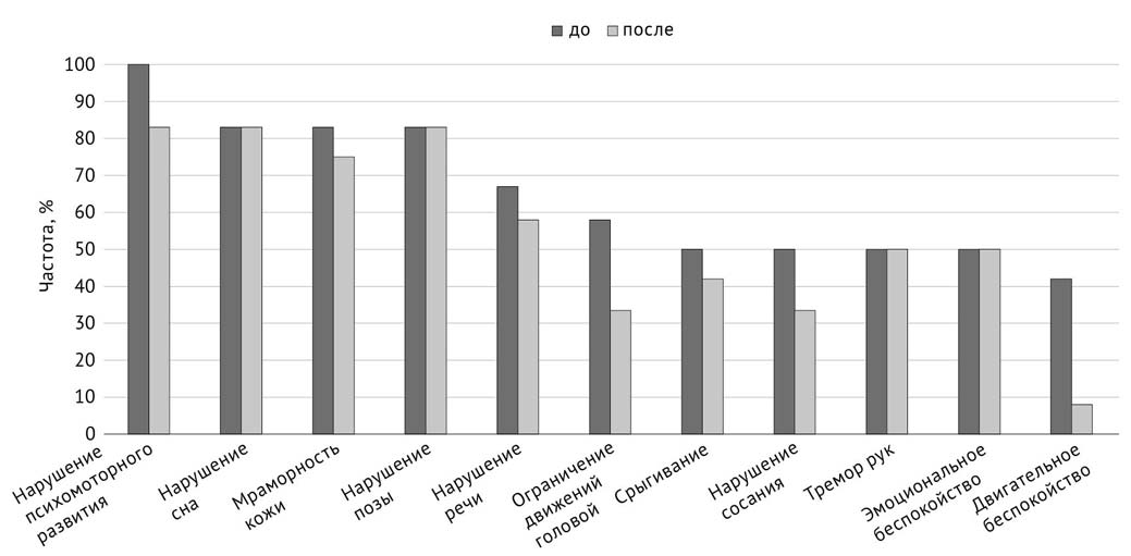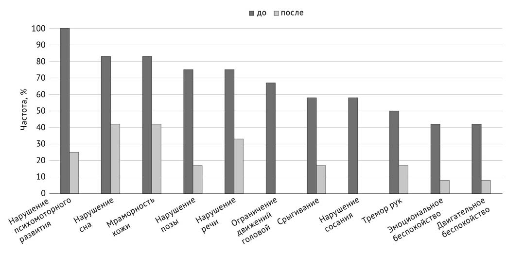После остеопатического лечения детей основной группы уменьшилось процентное соотношение количества жалоб родителей на функциональное состояние организма малышей. В частности, уменьшилось количество жалоб родителей на задержку психомоторного развития малышей (25%), нарушение их сна (42%), мраморность кожи (42%), нарушение позы (17%). По мнению родителей, их дети лучше стали держать голову, у них исчезли проблемы с сосанием, они стали меньше проявлять эмоциональное и двигательное беспокойство (p >0,05). Результаты исследования наглядно представлены на рис. 1.